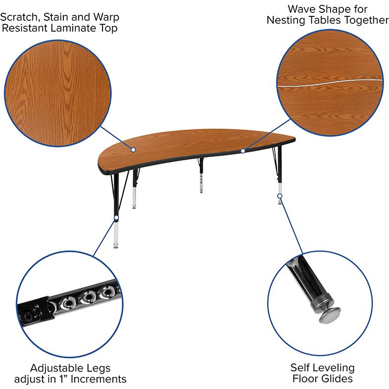 8 Piece Flexible Learning Wave Activity Table Set with Stack Chairs Activity Table Size: 60"W x 60"L x 16.25-25.25"H 1" Thick Thermal Fused Laminate Top is Scratch and Stain Resistant Top 16 Gauge Tubular Steel Legs adjust in 1" increments Black Powder Coated Upper Legs and Chrome Lower Legs Self-Leveling Nylon Floor Glides prevent scratches and wobbling Classroom Chair Size: 16"W x 15.5"D x 23.75"H; Back Size: 11.5"W x 11"H; Seat Size: 12"W x 11.5"D x 14"H Ergonomic shell stack chair is UV, heat, and cold protected Bright Nickel, non-corrosive chrome plated frame finish Space-saving design for the classroom, stacks 12 high