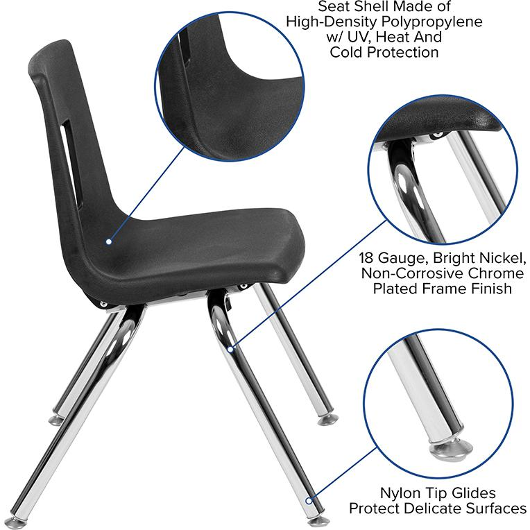 Prepare for a new year by incorporating these modern flexible learning table sets in your classroom that are designed to encourage all students to participate in group learning. You can create unlimited combinations using various shapes and colors. With our ergonomic shell student chairs included there is no need to shop around. Practical for any class setting this school table group will last you for many years with its durable thermal fused laminate top that is scratch, stain and warp resistant. Height adjustable chrome lower legs give you the flexibility to raise or lower the table. Self-leveling nylon floor glides keep the table from wobbling and protect your floor by sliding smoothly when you need to move it. Purchase our pre-built table and chair bundle for your classroom, daycare, Sunday school or home. The plastic stack chairs with 14" seat height are ideal for kindergarteners through 3rd grade students.