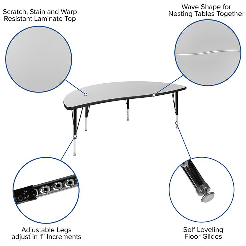 9 Piece Flexible Learning Wave Activity Table Set with Stack Chairs Activity Table Size: 60"W x 86"L x 16.25-25.25"H 1" Thick Thermal Fused Laminate Top is Scratch and Stain Resistant Top 16 Gauge Tubular Steel Legs adjust in 1" increments Black Powder Coated Upper Legs and Chrome Lower Legs Self-Leveling Nylon Floor Glides prevent scratches and wobbling Classroom Chair Size: 15"W x 14.5"D x 22"H; Back Size: 12"W x 11.5"H; Seat Size: 12"W x 12"D x 12"H Ergonomic shell stack chair is UV, heat, and cold protected Bright Nickel, non-corrosive chrome plated frame finish Space-saving design for the classroom, stacks 12 high