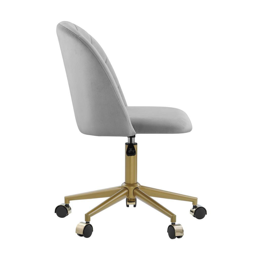 Add Beauty, Style And Function To Your Office With This Rolling Desk Chair. The Soft, Plush Frame Is Upholstered In Grey Velvet And Features A Rounded Back And Elegantly Curved Seaming. A Striking Gold Base With Matching Metal Castor Covers Adds To Its Beauty. The Seat Swivels 360 Degrees For Comfort, And The Seat Height Is Adjustable. Perfect For A Home Office, Dorm Room Or Vanity In Your Bedroom.