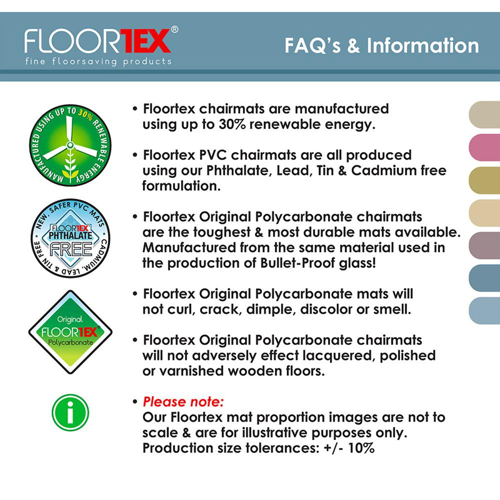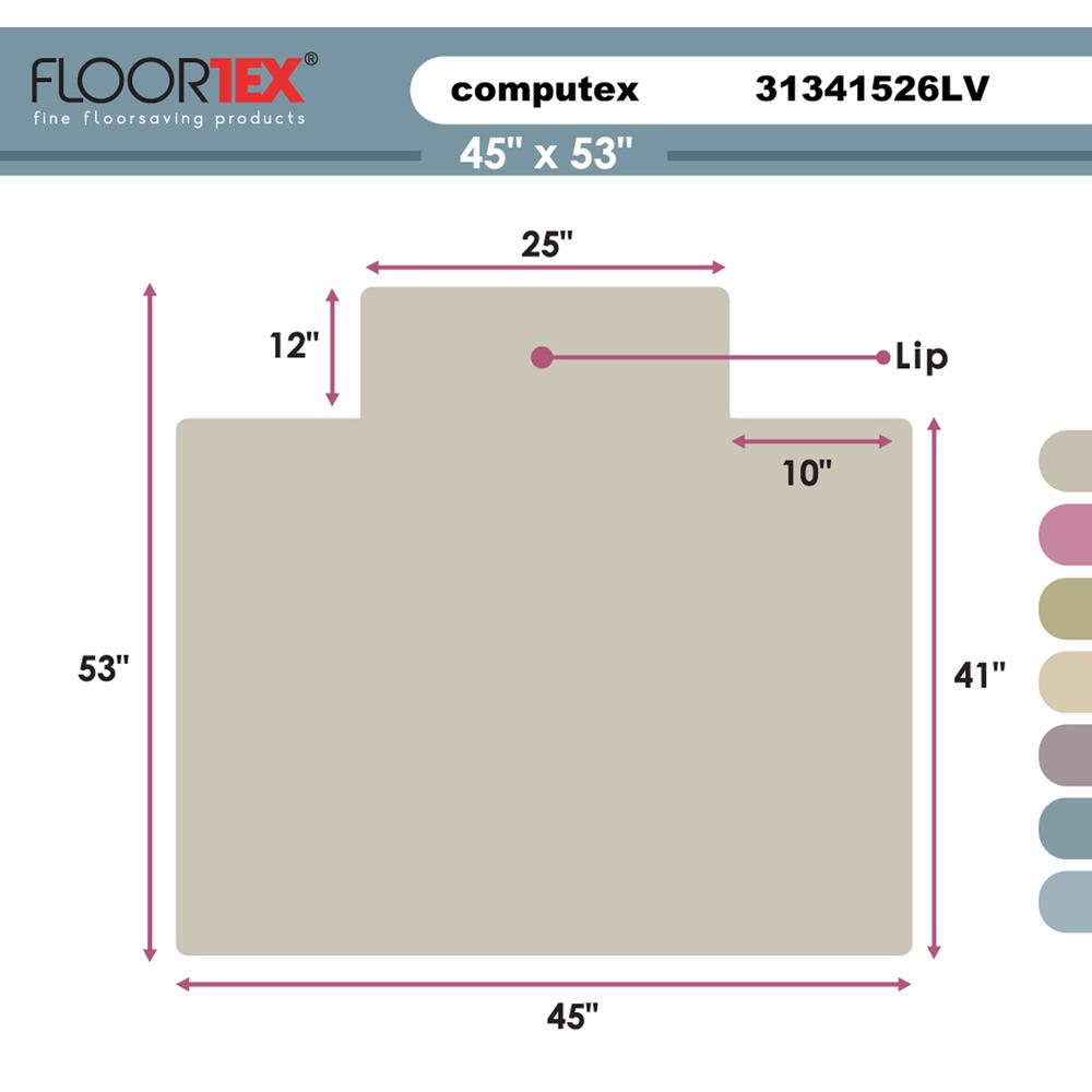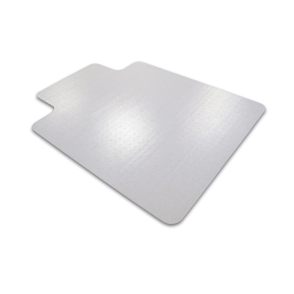 Clear floor protection mats made from a unique anti-static PVC formulation to provide optimum vinyl performance and durability. Prevents damage and wear to hard floors often caused chair casters and footwear. Anti-Static formula helps prevent the build up of static and dust that can be harmful to computers and other electrical equipment. Guaranteed not to crack, chip, break or shatter under normal use and correct application. Clear plastic formulation allows the beauty of your flooring to shine through Computex chairmats are 100% free of harmful DIDP Phthalate content for improved air quality over conventional PVC products. Free of chemical content banned from child related products. Also free of tin, lead, cadmium and BPA All Floortex PVC/ Vinyl protector mats are produced at our manufacturing site where 50% of the energy comes from on-site and external renewable sources. Contains up to 25% recycled content and 100% recyclable for a reduced carbon footprint Please note, due to the manufacturing process this product has a +/- 5% size tolerance. All measurements are rounded to the nearest inch Gripper back for use on standard pile carpets up to 3/8" thick including carpet pad. Not suitable for hardwood or hard floor applications. Product Size - Rectangular including lip 45" x 53" (Lip Size 25" x 12") Limited Lifetime Warranty