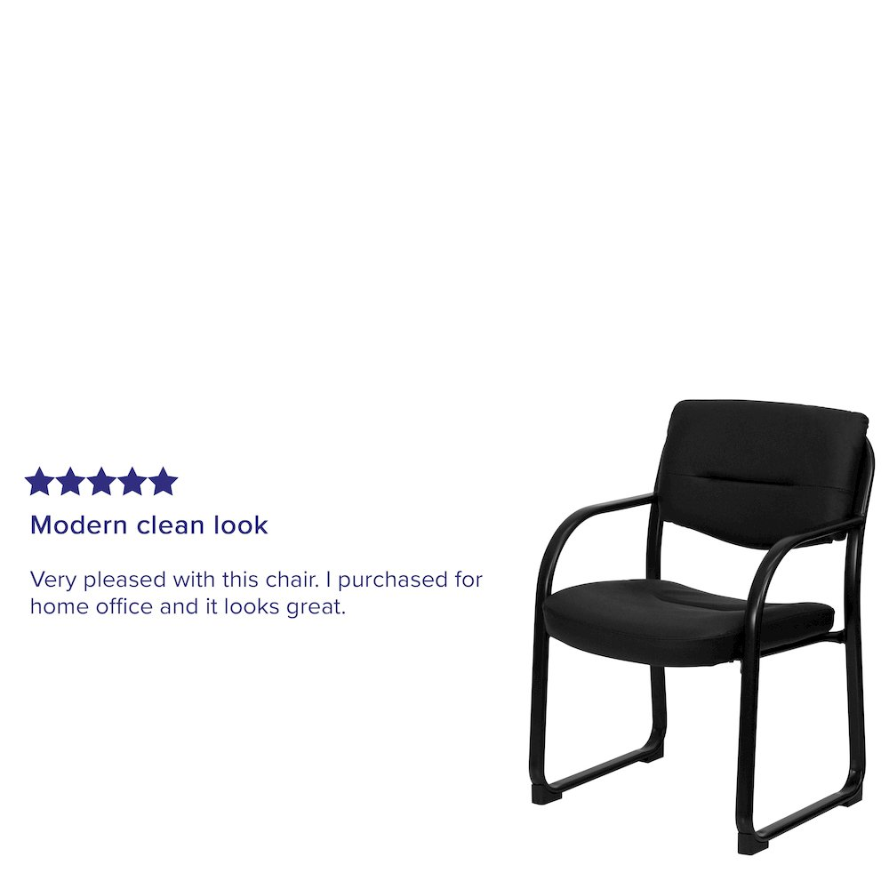 Add refined style to your reception waiting room or inner office with this LeatherSoft executive side reception chair. Featuring contoured cushions and curved arms to relieve stress on the neck and shoulders, this chair will provide supreme comfort for clients and guests. LeatherSoft is leather and polyurethane for added softness and durability. The open back design paired with the sled base frame in a black powder coated frame finish give this side chair an elegant, understated quality that will be noticed.