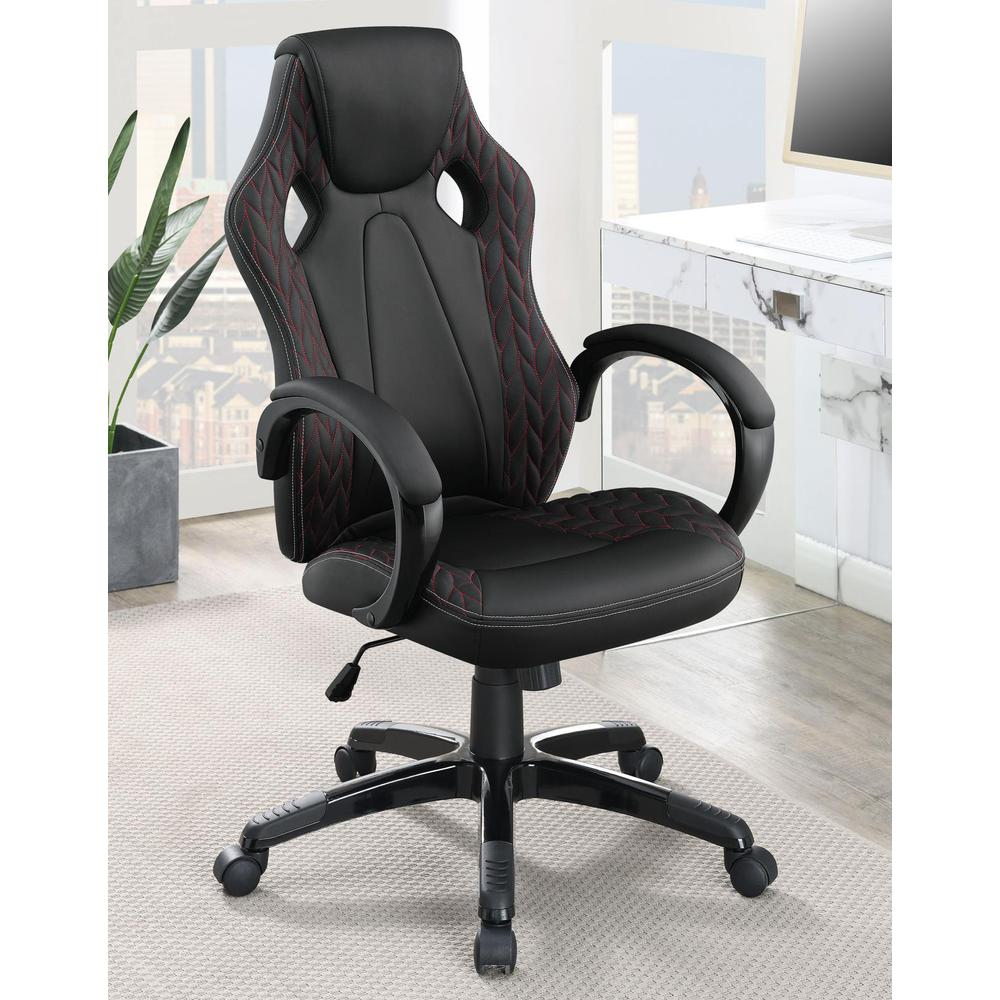 Perfect for a modern home office, this contemporary office chair is wrapped in a black leatherette that offers a bold statement piece. Accenting the black leatherette is a botanical-inspired herringbone pattern with a red stitching details, giving a subtle pop of color. Rounded padded arms provide a place to rest your elbows, while a padded headrest and seat offer long-lasting all-day support. Mounted to a rolling base with five wheels, this mobile office chair easily glides throughout the office space to retrieve items and more. In addition, this office chair can be adjusted, lifted to fit your preferable desk height.