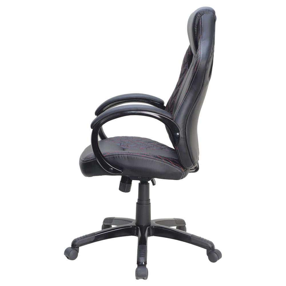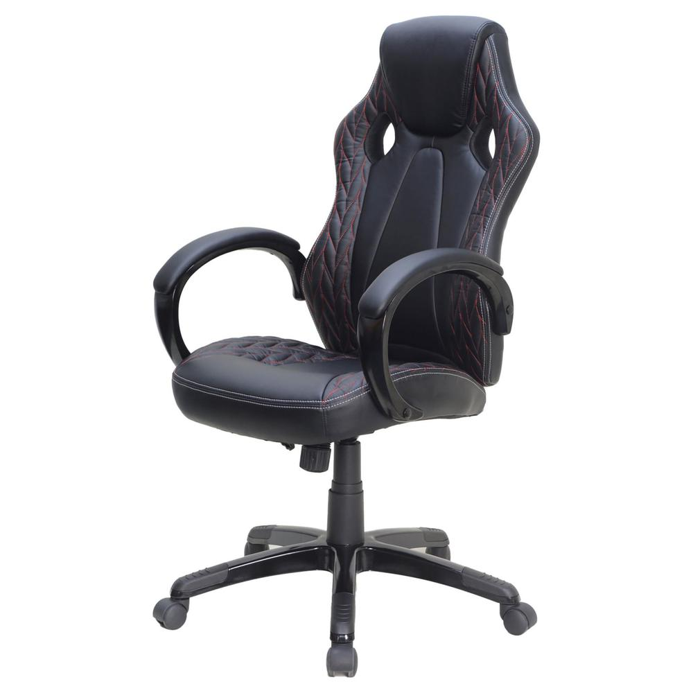 Contemporary office chair wrapped in black leatherette with botanical-inspired herringbone pattern and red stitching details for a bold statement piece Rounded padded arms, padded headrest and seat for long-lasting all-day support Mounted to a rolling base with five wheels for easy mobility Adjustable and liftable to fit your preferable desk height Perfect for a modern home office
