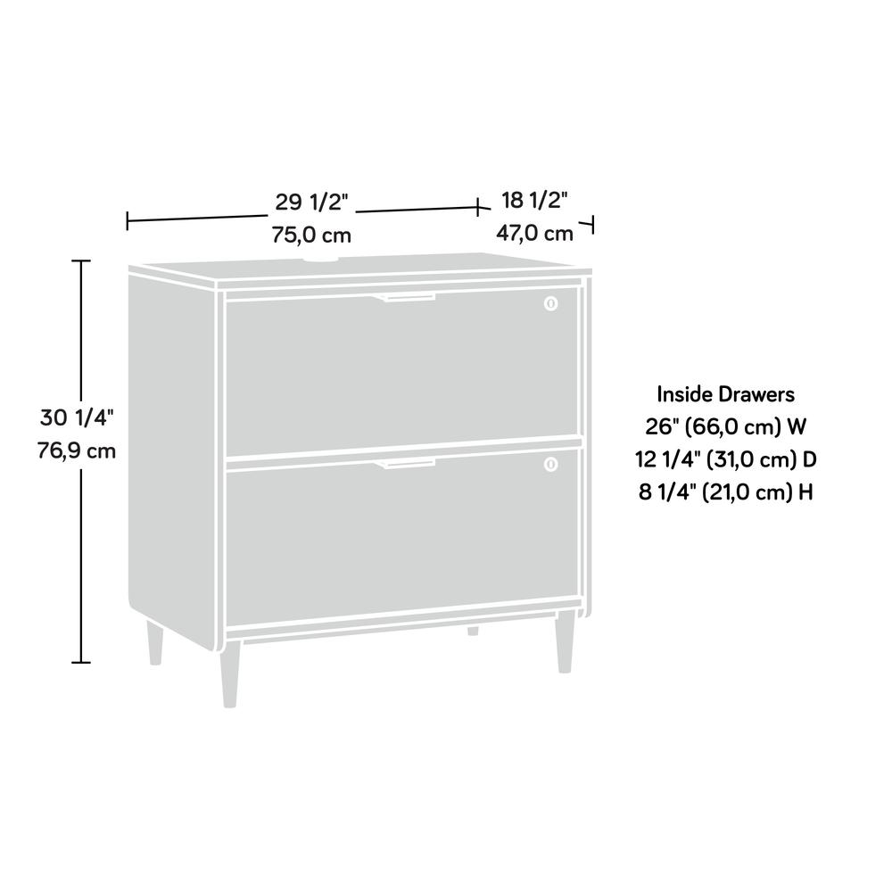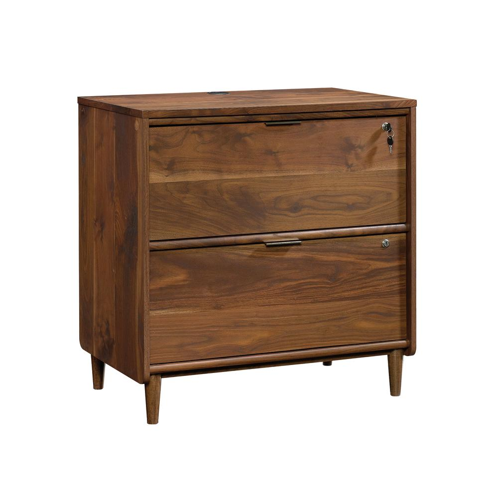 Keep your office or workspace organized and in style with this handsome lateral file from the Clifford Place collection. This mid-century inspired file cabinet features two spacious file drawers that opens and close on smooth full extension slides. Each drawer accommodates letter or legal size hanging files so you can keep all your important files and papers organized and easily accessible. This lateral file also includes a safety mechanism that only allows one drawer to open at a time. Worried about the safety of your files while you are away from the office? Do not fret, each drawer includes and key and lock for secure storage! It also features a grommet hole and pass-through to keep all your cords and wires neatly out of the way. Finished in a warm Grand Walnut and accented with solid wood feet and bold brass hardware, this simply stunning storage cabinet adds style and functionality to your office or workspace.
