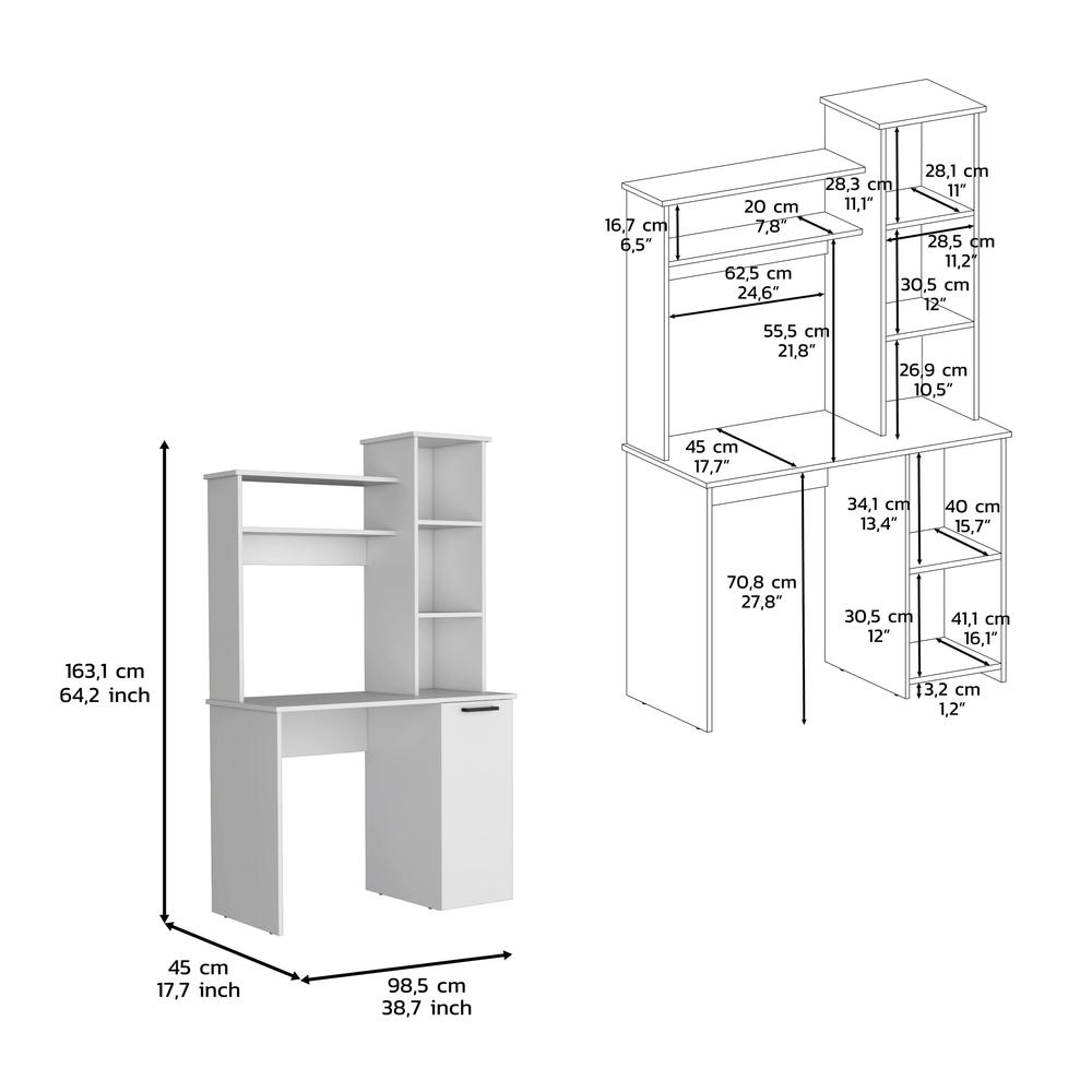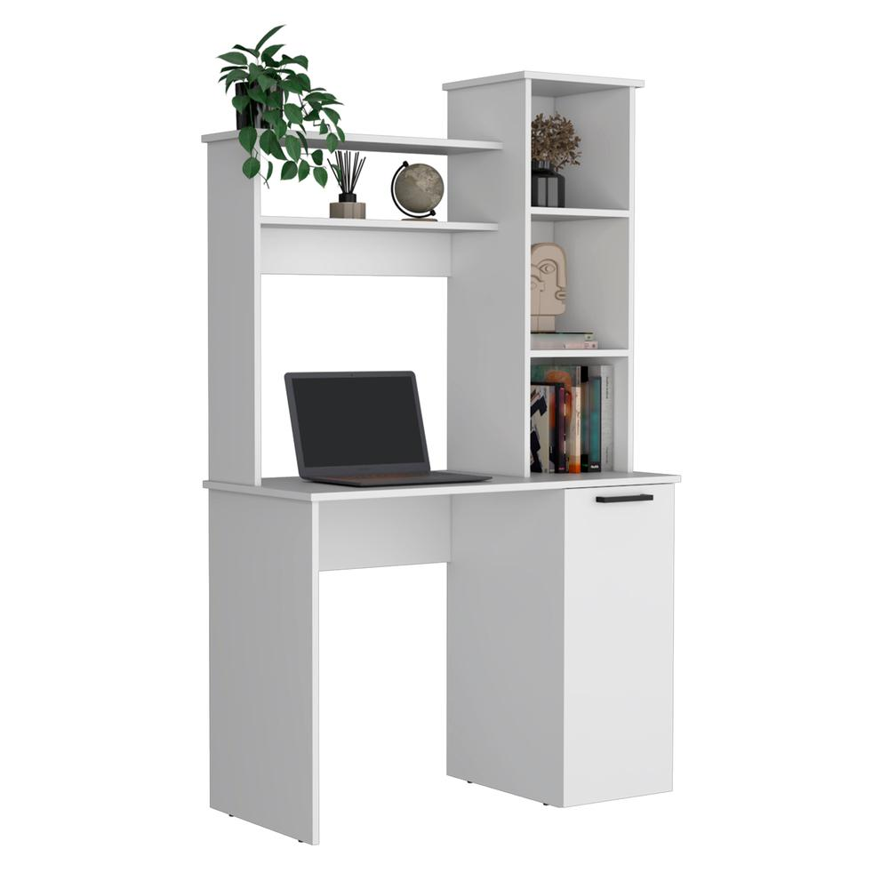 Generous Workspace: A 25.8"W x 17.7"D work surface designed for multitasking ease. Stylish Hutch: Ideal for showcasing decor or housing essential office tools. Diverse Storage: Multiple shelves and a unique door cabinet cater to all your organizational whims. Elegant Finishes: Available in three finishes – white, clasic black, and modern light gray – for tailored office aesthetics.