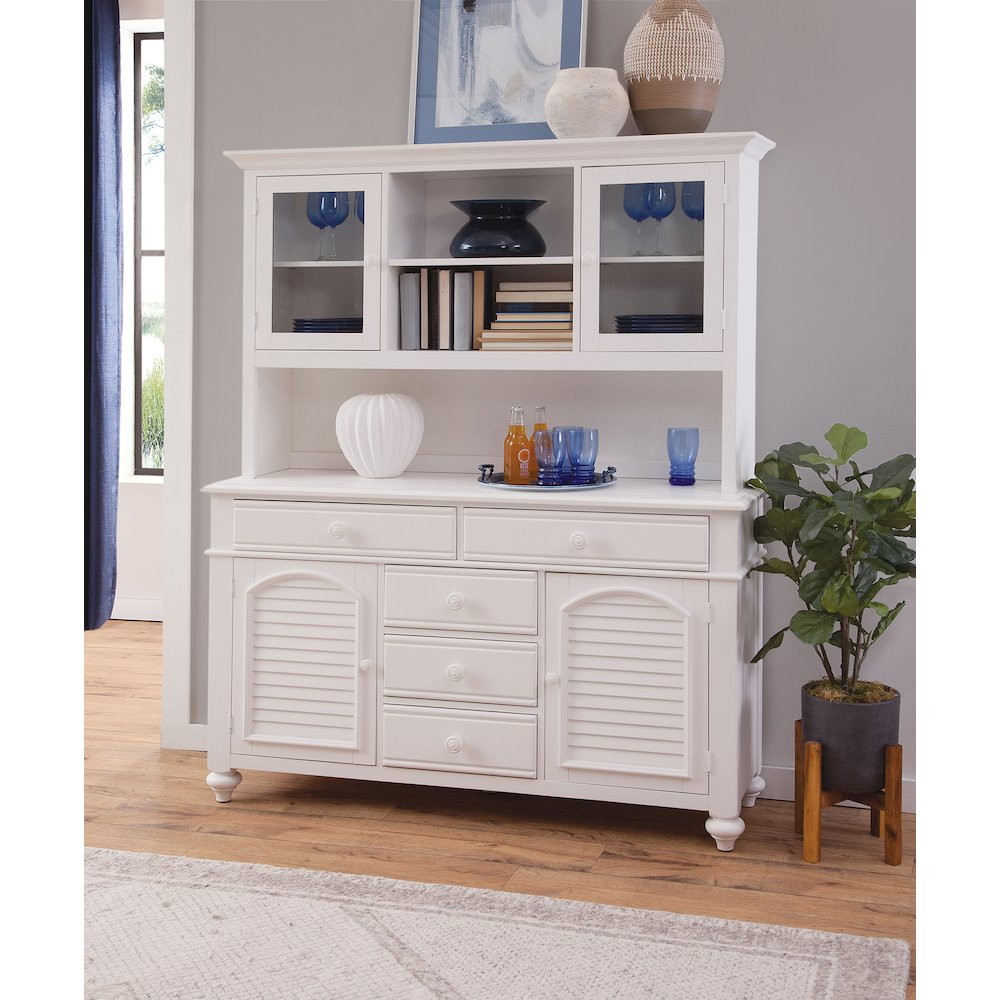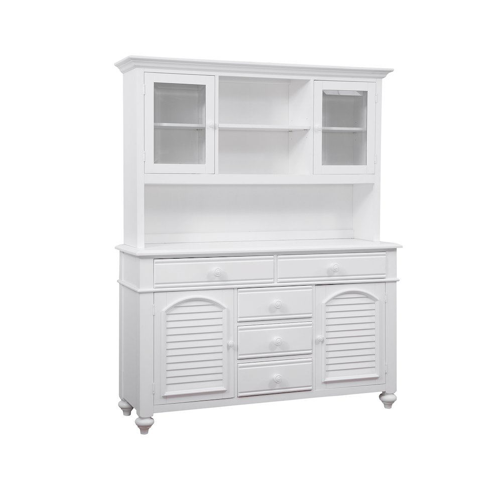 One hutch included Open upper shelves Adjustable shelves behind doors Easily compliment coastal, condo, youth, cottage and traditional style
