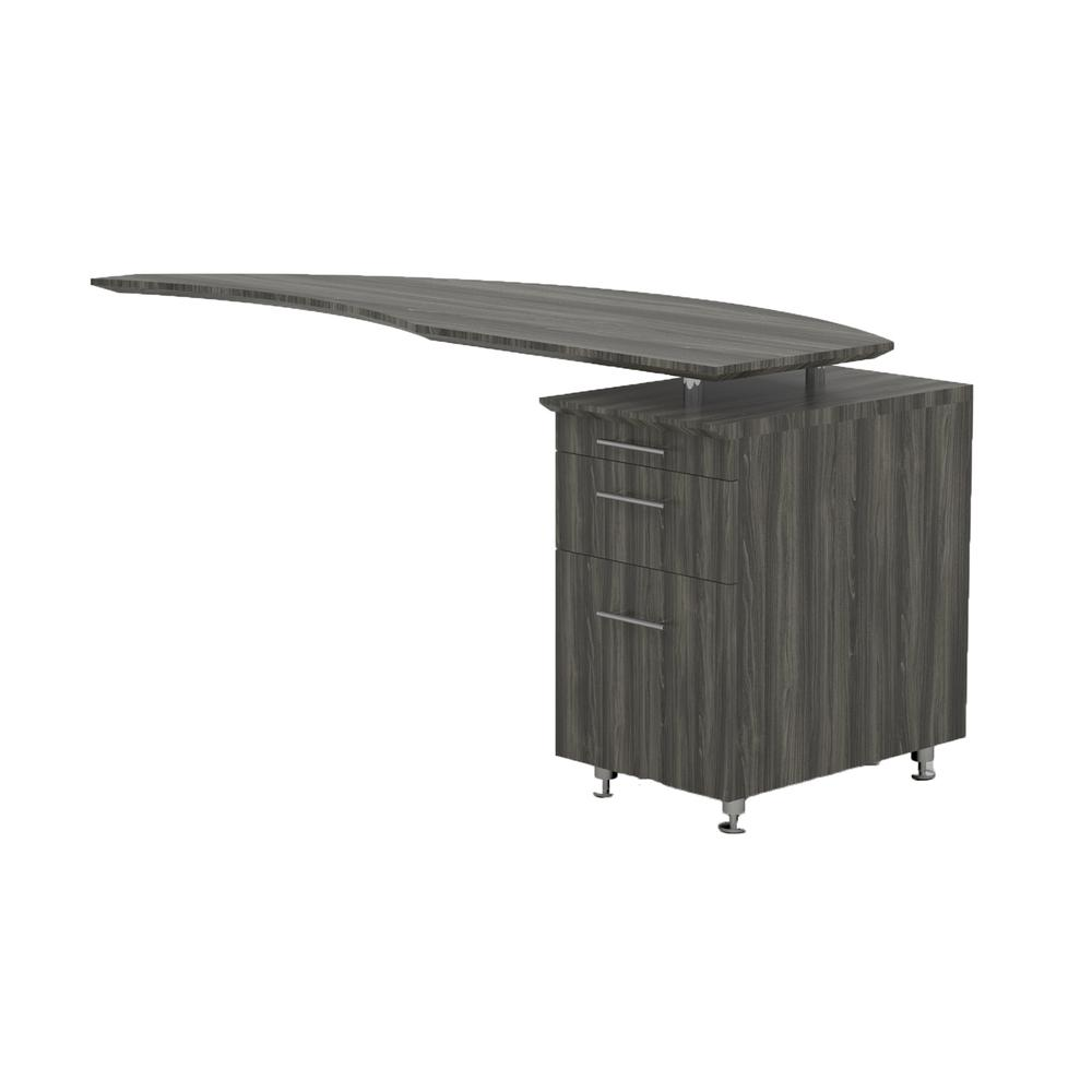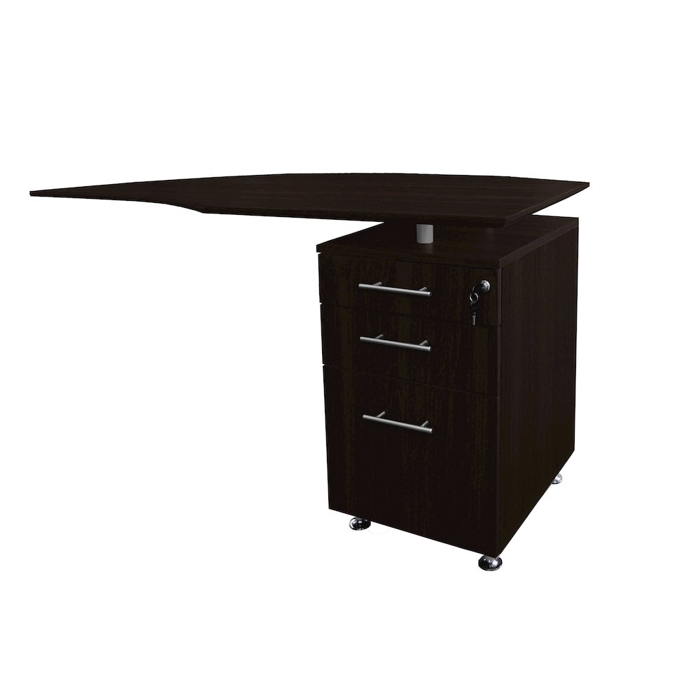Creates L-shaped work surface when attached to desk Supported by Pencil-Box-File pedestal Pedestal drawer finished to match exterior laminat Gang-Lock features removable core Stands off floor on silver legs 1" thick work surface with a distinctive beveled edge