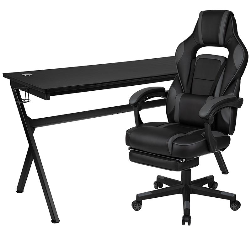 Gaming Desk and Chair Bundle Desk: 55.125"W x 23.625"D x 30.375"H Textured .75" Thick Black Laminate Top with removable mouse pad top and 2 Cable Management Grommets Detachable Cup Holder (3.5"W x 3.5"H) and Headset Hook (3.25"W x 2.25"D) Black Powder Coated Frame Finish with Self Leveling Floor Glides High Back Gaming Chair with Reclining Curved Arms: 28"W x 29.25-68"D x 48-51.25"H Adjustable and Removable Headrest Pillow and Massaging Lumbar Pillow with Included 3 foot USB Power Cord Reclining Back Lever adjusts 95° ~ 175°; Slide-Out Footrest - pull loop and flip-up Tilt Lock Mechanism rocks/tilts the chair and locks in an upright position LeatherSoft is leather and polyurethane for added Softness and Durability