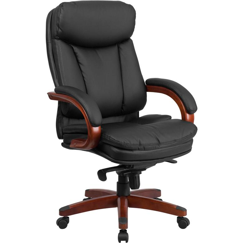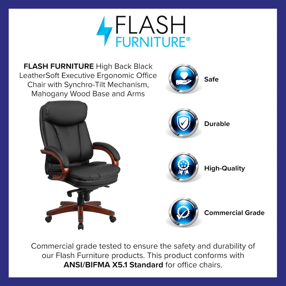 Contemporary Office Chair Black LeatherSoft Upholstery with CAL 117 Fire Retardant Foam High Back Design with Pillow Top Headrest, Padded Loop Arms Built-In Lumbar Support, Contoured Back and Seat Dual Paddle Control Mechanism 2-to-1 Locking Synchro Tilt Adjustment tilts the back and seat in unison for a comfortable seating position, Tilt Tension Adjustment Knob adjusts the chair's backward tilt resistance Pneumatic Swivel Seat Height Adjustment Mahogany Wood Capped Metal Base with Black End Caps Dual Wheel Casters LeatherSoft is leather and polyurethane for added Softness and Durability