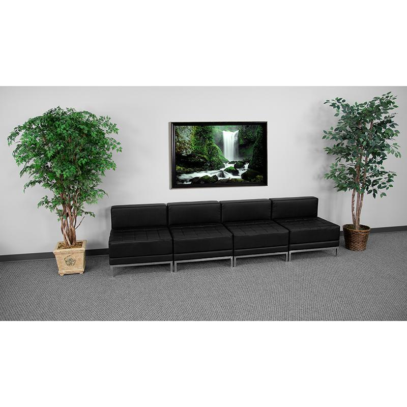 Contemporary Reception Set Add on pieces as your business grows Modular components make reconfiguring easy with endless possibilities Features: Black LeatherSoft Upholstery Smooth Back and Tufted Seat Fixed Back and Seat Cushions Foam Filled Cushions CA117 Fire Retardant Foam Exposed Accent Bar