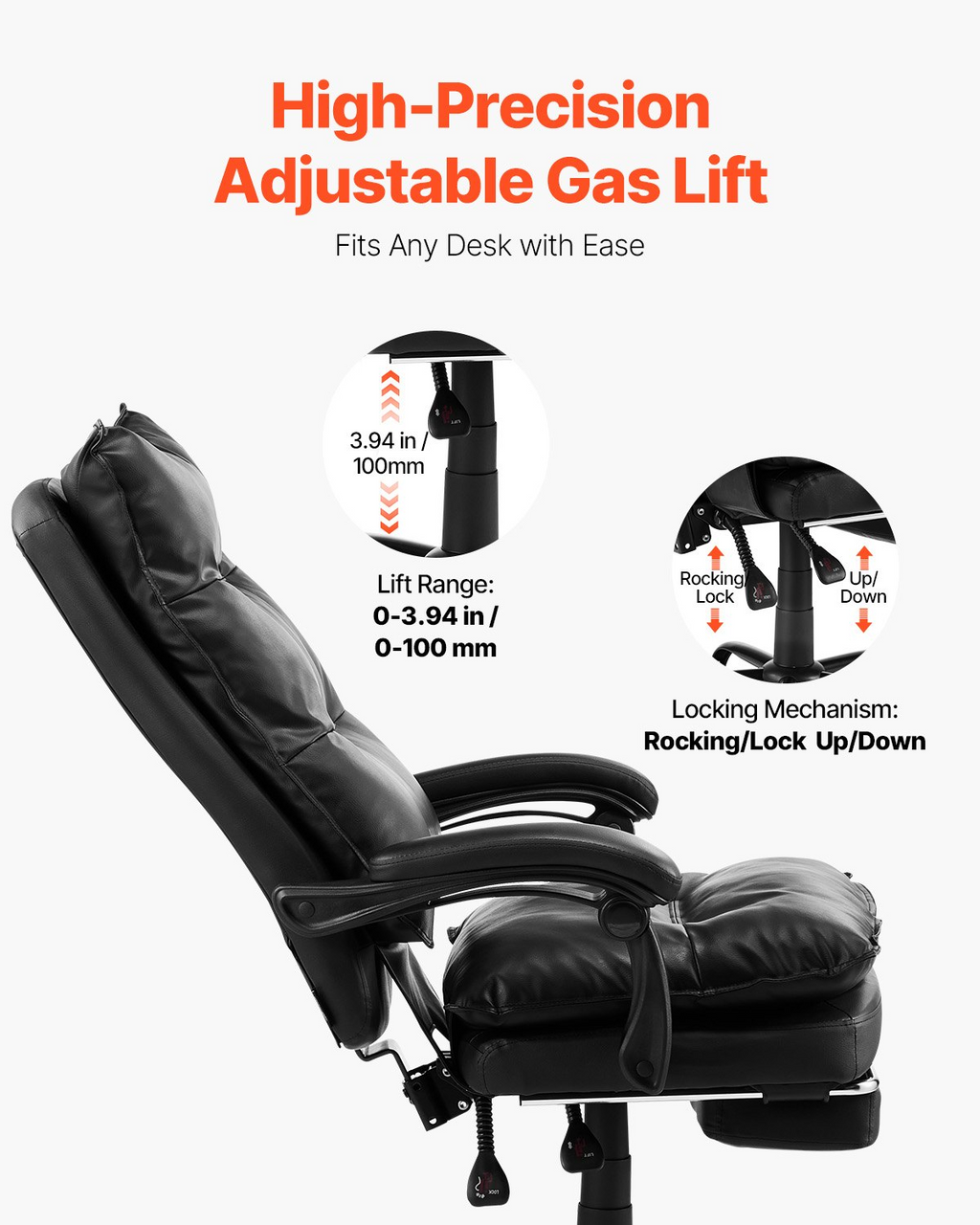 Caster Material: Nylon (Plastic),Seat Width: 23.43 in / 595 mm,Main Materials: Steel + Foam + PU Leather + PVC + Wood,Weight Capacity: 400 lbs181.44 kg /,Footrest: Large Integrated Footrest,Item Model Number: HC-2507-2,Product Weight: 44.34 lbs / 20.10 kg,Gas Lift Class: Class 3,Features: Backrest Tilts up to 135°, Lumbar Cushion, Height-adjustable,Product Dimensions: 28.00 x 27.00 x 51.33 in / 710 x 685 x 1304 mm,Backrest Height: 29.7 in / 754 mm,Lift Range: 0-3.94 in / 0-100 mm