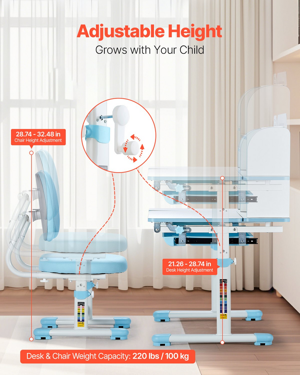 VEVOR Kids Study Chair and Desk Set, Study Desk and Chair for Kids with Bookshelf & Storage Drawer, Adjustable Height & 0-40° Tilted Desktop Desk and Chair, Study Table for Bedroom & Study Room, Blue