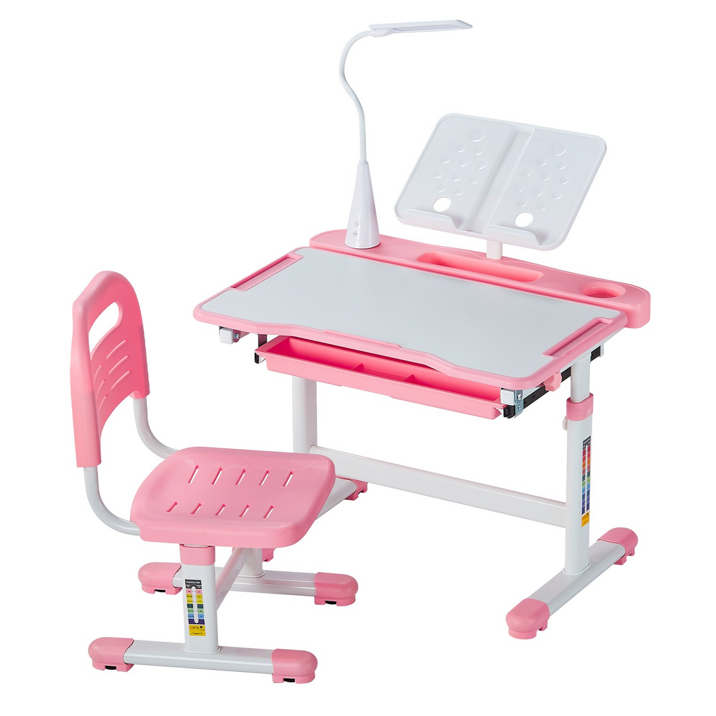 VEVOR Kids Study Chair and Desk Set, Study Desk and Chair for Kids with Table Lamp, Adjustable Height & 0-40° Tilted Desktop Kids Desk and Chair, Children Study Table for Bedroom & Study Room, Pink