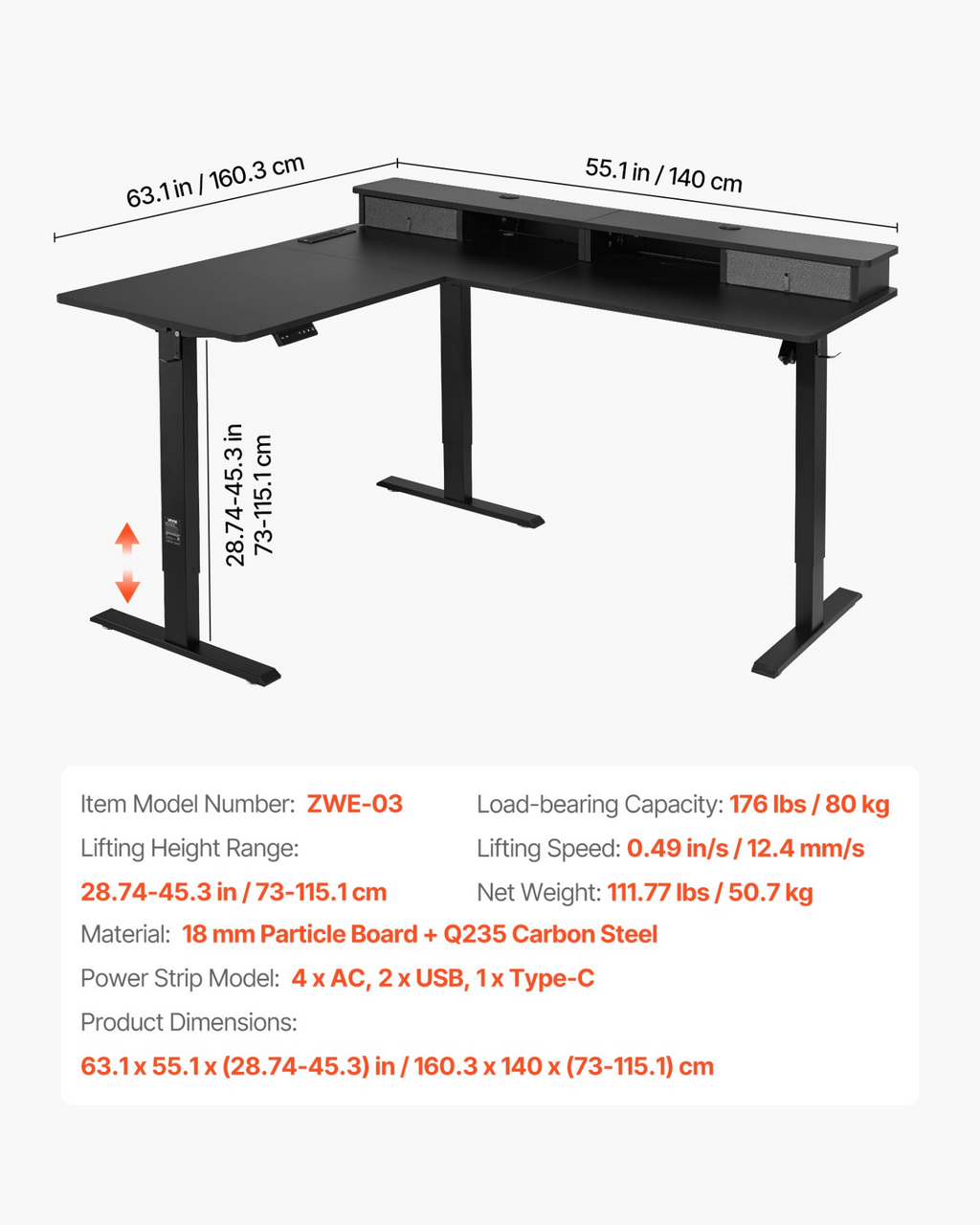Lifting Speed: 0.49 in/s / 12.4 mm/s,Load-bearing Capacity: 176 lbs / 80 kg,Item Model Number: ZWE-03,Material: 18 mm Particle Board + Q235 Carbon Steel,Lifting Height Range: 28.54-45.28 in / 72.5-115 cm,Product Dimensions: 63.1 x 55.1 x (28.74-45.3) in / 160.3 x 140 x (73-115.1) cm,Net Weight: 111.77 lbs / 50.7 kg,Power Strip Model: 4 x AC, 2 x USB, 1 x Type-C