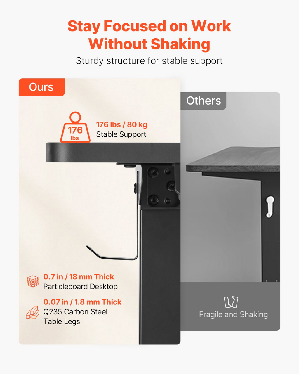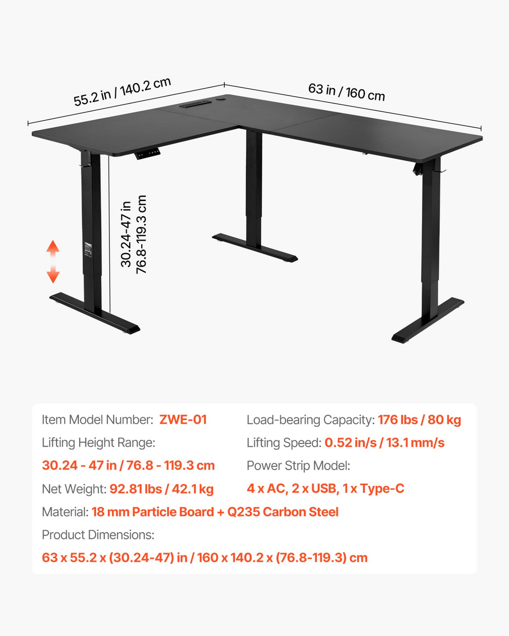 Lifting Speed: 0.52 in/s / 13.1 mm/s,Load-bearing Capacity: 176 lbs / 80 kg,Item Model Number: ZWE-01,Material: 18 mm Particle Board + Q235 Carbon Steel,Lifting Height Range: 30.24 - 46.97 in / 76.8 - 119.3 cm,Product Dimensions: 63 x 55.2 x (30.24-47) in / 160 x 140.2 x (76.8-119.3) cm,Net Weight: 92.81 lbs / 42.1 kg,Power Strip Model: 4 x AC, 2 x USB, 1 x Type-C